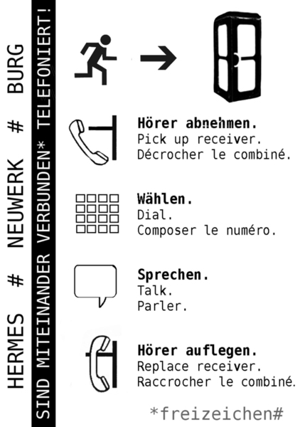 Zur Jahresausstellung 2011 der Kunsthochschule Burg Giebichenstein haben sich Studierende der Kusterziehung/-pädagogik zusammengefunden, um die direkte Kommunikation zwischen den Standorten Burg, Hermes und Neuwerk zu fördern. Zur Verbidnung der Standorte kamen Telefone in die Telefonzellen.