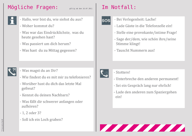 Jede Telefonzelle war ab der Jahresausstellung für ein Jahr mit einer Anrufdirektschaltung eingerichtet: Nahm man den Hörer an einem der Telefone ab, klingelte es an den beiden anderen Standorten. Wer zuerst an einem der anderen Standorte auf das Klingeln reagierte, war verbunden. Es war ein Aufeinandertreffen von zufälligen Spieler und immer eine Kommunikation zwischen zwei der drei möglichen Orte